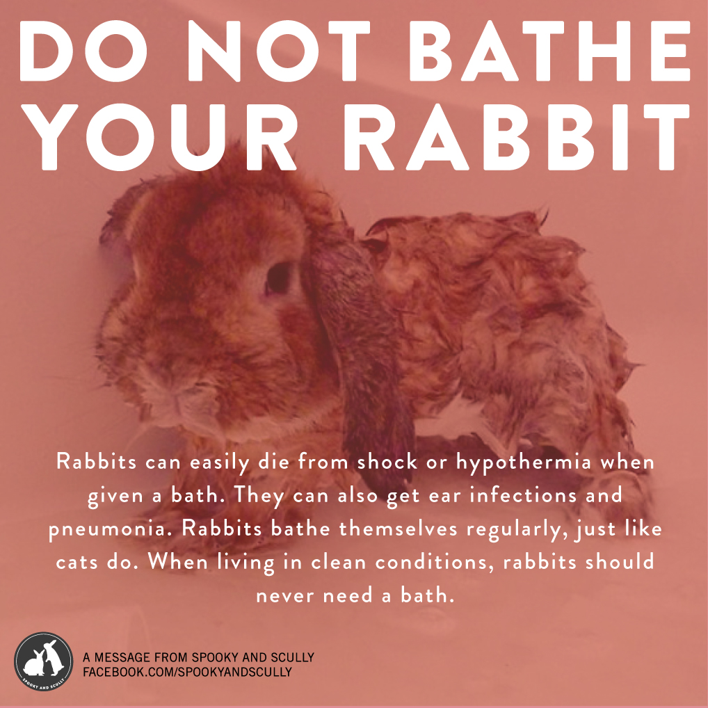 It is not okay to give your bunny a bath, they can go into shock or get very sick. If you keep your rabbit’s living area clean, they should never need a bath. IF for some reason, your rabbit absolutely needs one, you should consult your vet to have them do it. Please share this poster.