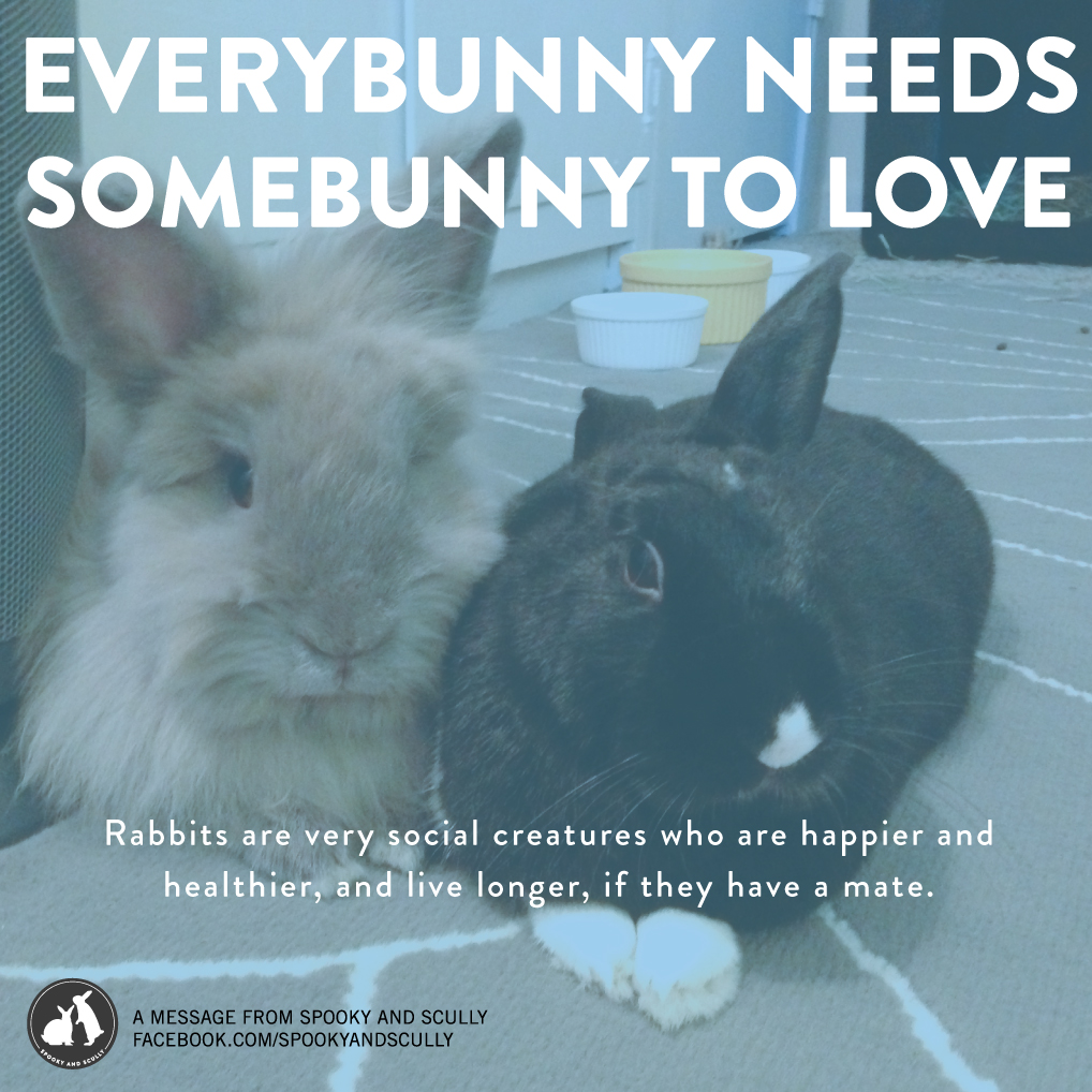 Rabbits are social animals that benefit from living in pairs or groups. Despite the need to live with another rabbit, you cannot just put two rabbits in a cage and expect them to immediately get along. Rabbits, like humans, must date first. During their courtship, the rabbits learn to trust each other and eventually fall in love. Rabbit dating is referred to as bonding. Sometimes it is short and easy, but other times it can be long and rough. It took Spooky and Scully an entire year to bond with each other.